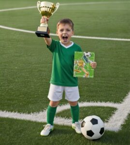 In this thrilling soccer adventure, your child will experience the highs and lows of sports play! As your child lay in bed dreaming about tomorrow’s big game, it is known that it will be one of the most important games he or she will ever play. A scout from a national team will be there to watch and perhaps select players. During the game the next day, your child has stellar play and is actually selected. At the championship, although nervous in front of the large crowd and TV cameras, your child, along with help from the team-mates, scores for a tie goal. During the final three minutes of the game, the crowd is silent and time seems to stand still…just before your child kicks the winning score!